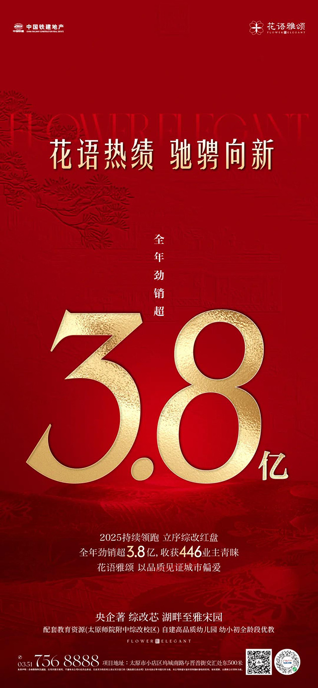 中国铁建花语雅颂持续领跑,从开盘至今,仅百余天便收获446位业主青睐,劲销超3.8亿元,在太原新盘销售榜中独占鳌头。