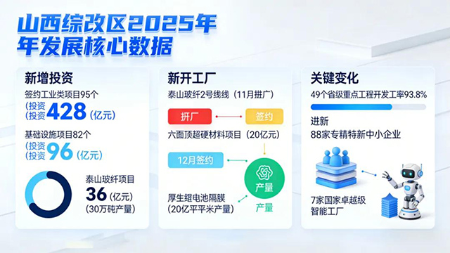 据悉,山西综改区2025年全年签约95个工业类项目,总投资428亿元,其中泰山玻纤、龙昇能源等重点项目进展顺利。省级重点工程开复工率 93.8%,全省领先。新增 88 家专精特新企业,产业集群不断壮大,综改区正以高质量发展态势持续推进。